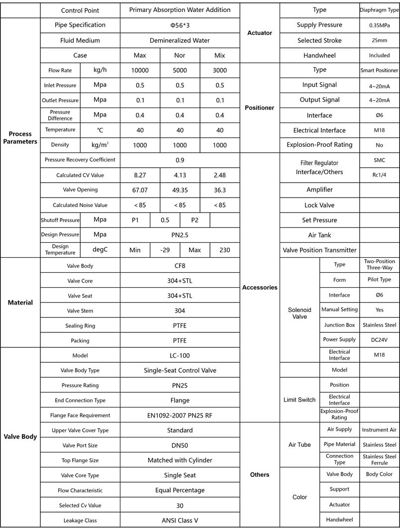 is the main reason that the sulfuric acid concentration of the regulator can not be automatic is caused by the improper selection of the regulator, to choose the regulator that meets the regulation of the device, it is necessary to be clear about the process parameters of each regulator and the performance parameters of the regulator. The following is the recommended 400Kt/a control valve selection parameters table. Need other device size water control valve selection parameter table, please contact us. We are happy to provide you free of charge.