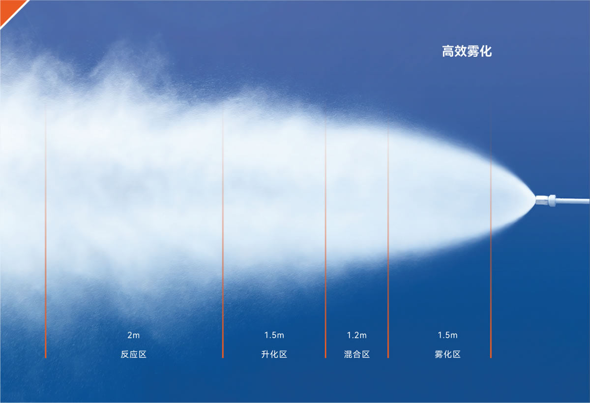 實心霧化分層燃燒技術其霧炬呈旋轉實心錐形,實現了硫霧的分層燃燒。有效避免了空心錐霧炬表面爆燃導致的前端缺氧問題,無升華硫的產生、燃燒后移以及焚硫爐超溫等現象。