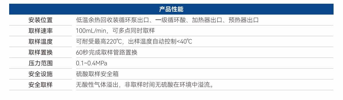 整個取樣過程在完全密閉的回路中進行,通過多重密封結構和自動泄壓保護機制,確保高溫、高腐蝕性硫酸在降溫與取樣過程中不與外界接觸。設備配備智能溫控模塊,實時監測酸液溫度并動態調節冷卻速率,保障樣品代表性與操作安全性。所有濕接觸部件均采用高純度聚四氟乙烯與哈氏合金材質,耐受濃硫酸強腐蝕環境,使用壽命長,維護簡便。