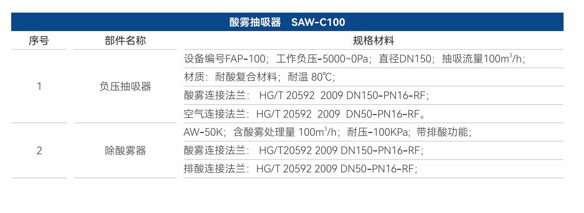 酸霧抽吸器利用裝置主風(fēng)機(jī)空氣作為動力,采用無可動部件驅(qū)動,運(yùn)行穩(wěn)定可靠,免維護(hù)。通過負(fù)壓發(fā)生器產(chǎn)生可調(diào)節(jié)負(fù)壓,將循環(huán)槽內(nèi)揮發(fā)的SO2、酸霧徑酸霧高效除霧器把酸霧中所含的80%硫酸霧除去,并回收至循環(huán)槽內(nèi)。經(jīng)過高效除外器的酸霧氣體被抽吸至干燥塔入口或者尾吸塔出口進(jìn)行回收利用或者氣體凈化處理。酸霧抽吸器采用耐腐蝕復(fù)合材料能適應(yīng)各種濃度的酸霧或含酸泥氣體。