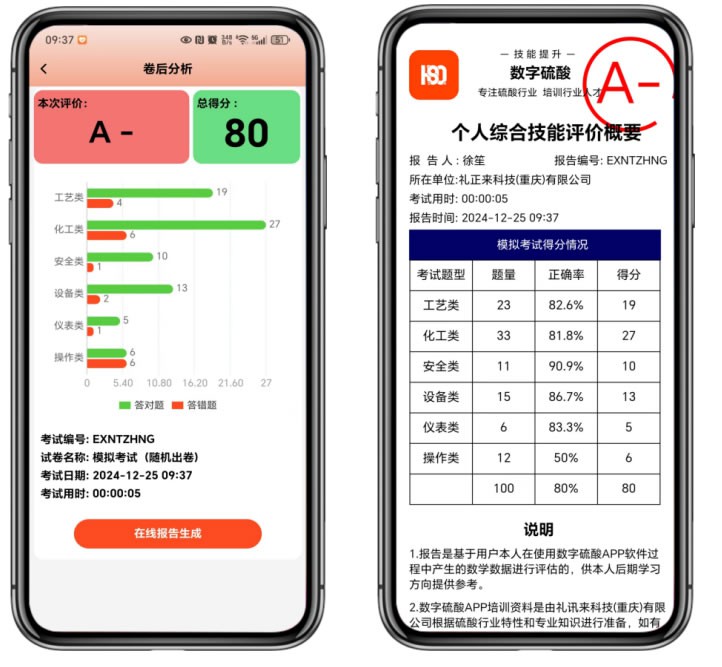 在模擬考試過程中,我們采用系統(tǒng)隨機抽取試卷的方式,將測試題目類型劃分為單選題、多選題、判斷題和填空題。考生需在規(guī)定的時間內(nèi)完成所有題目,并提交試卷以計算總分。點擊“在線報告生成”按鈕后,即可生成“個人綜合技能成績表”。
