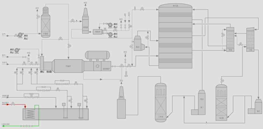 在硫酸生產過程中,流程圖是不可或缺的一部分,如果我們把DCS控制系統比作硫酸生產的大腦,那么流程圖就如同大腦的視覺皮層一樣關鍵,它關系著操作人員對硫酸生產的直觀理解,直接影響控制效率。