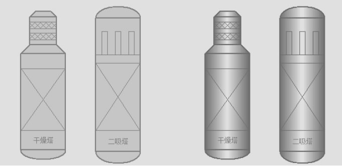 在器件繪制上,我們采取實際特征進行平面繪制,方便操作人員快速識別,器件色彩方面可按照客戶需求進行調整,并增添立體感設計,這里以干燥塔及二吸塔為例,如圖2。