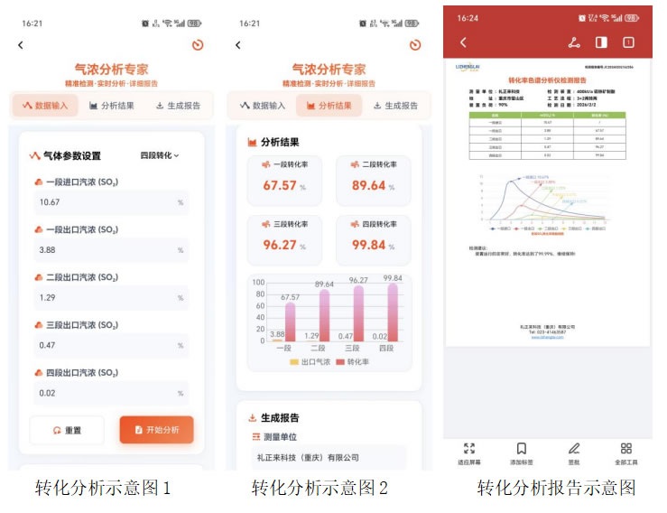 我司全新推出的“轉(zhuǎn)化分析”功能,專為精細(xì)化評估轉(zhuǎn)化器運(yùn)行效能而設(shè)計(jì)。在“數(shù)據(jù)輸入”版塊,用戶可根據(jù)實(shí)際工藝情況,選擇四段或五段轉(zhuǎn)化模式,并輸入各段出口氣體濃度,系統(tǒng)將依據(jù)專業(yè)計(jì)算公式,精準(zhǔn)得出每段的轉(zhuǎn)化率;在“分析結(jié)果”版塊,將為您提供清晰的數(shù)值結(jié)果與趨勢圖表,全面展現(xiàn)各段轉(zhuǎn)化效率及轉(zhuǎn)化器各層的健康運(yùn)行狀態(tài);在“生成報(bào)告”版塊,支持生成結(jié)構(gòu)化檢測報(bào)告——涵蓋測量單位、檢測地址、裝置工況、工藝流程、裝置負(fù)荷等關(guān)鍵信息,并允許檢測人員添加專業(yè)建議,形成完整、可追溯的檢測閉環(huán)。