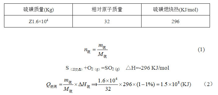 我們假設(shè)硫磺的總質(zhì)量為1.6×104 Kg,采用以定質(zhì)量求其物質(zhì)的量計算硫磺總?cè)紵裏岬姆绞降贸隽蚧侨紵龝r總熱量。通過查表獲得硫的摩爾質(zhì)量,摩爾質(zhì)量與相對原子質(zhì)量兩者在數(shù)值上相等但單位不同,相對原子質(zhì)量是一個無單位的比值,雖然兩者在數(shù)值上相等,但是單位不同,不能完全等同。再根據(jù)1mol硫磺的燃燒熱為296 KJ/mol來得出硫磺總?cè)紵裏帷?熱量損失計1%,燃燒熱取絕對值,忽略壓力變化)