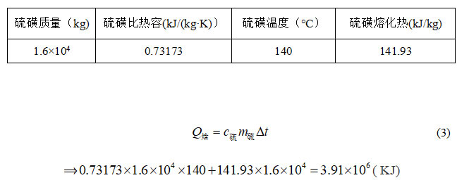熱量是指系統(tǒng)在熱力學(xué)過程中由于溫度差而傳遞的能量。而硫磺燃燒反應(yīng)過程中不同溫度條件下涉及到多個熱量傳遞的過程。查表可得硫磺在140℃時的比熱容為0.73173 kJ/kg·K,根據(jù)已知參數(shù),利用熱量公式Q=cm△t計算得出硫磺在140℃時的總焓熱。(忽略壓力變化)